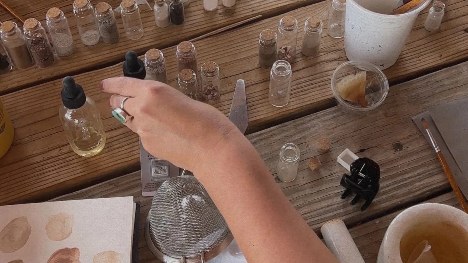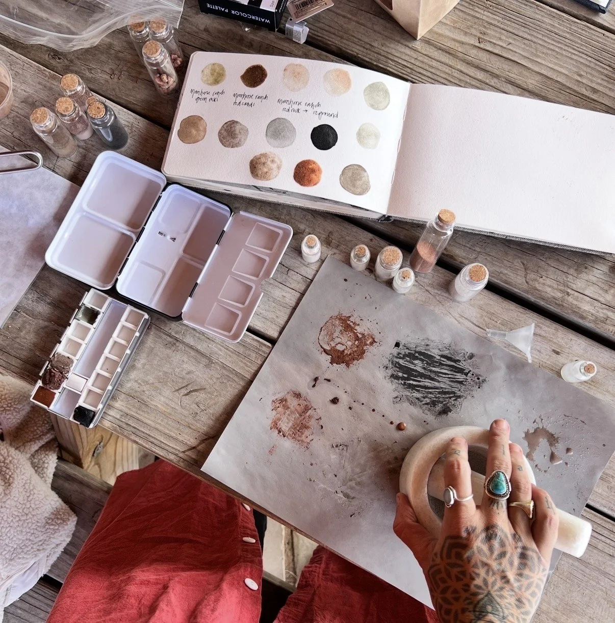 In Santa Fe, we spent two days at an artist’s ranch tucked into the desert, learning how to make our own pigments from the land. We knew it would be beautiful, but we didn’t expect the kind of childlike joy it would unlock. Something shifted. Suddenly we were collecting rocks everywhere we went—pockets full, eyes on the ground, delight in the smallest rocks… something we once stepped over without noticing became something precious, something we could turn into color and art. We laughed a lot. We played. We felt like little kids again, remembering how magical the world feels when you’re paying attention. The energy was gentle, healing, and magnetic!